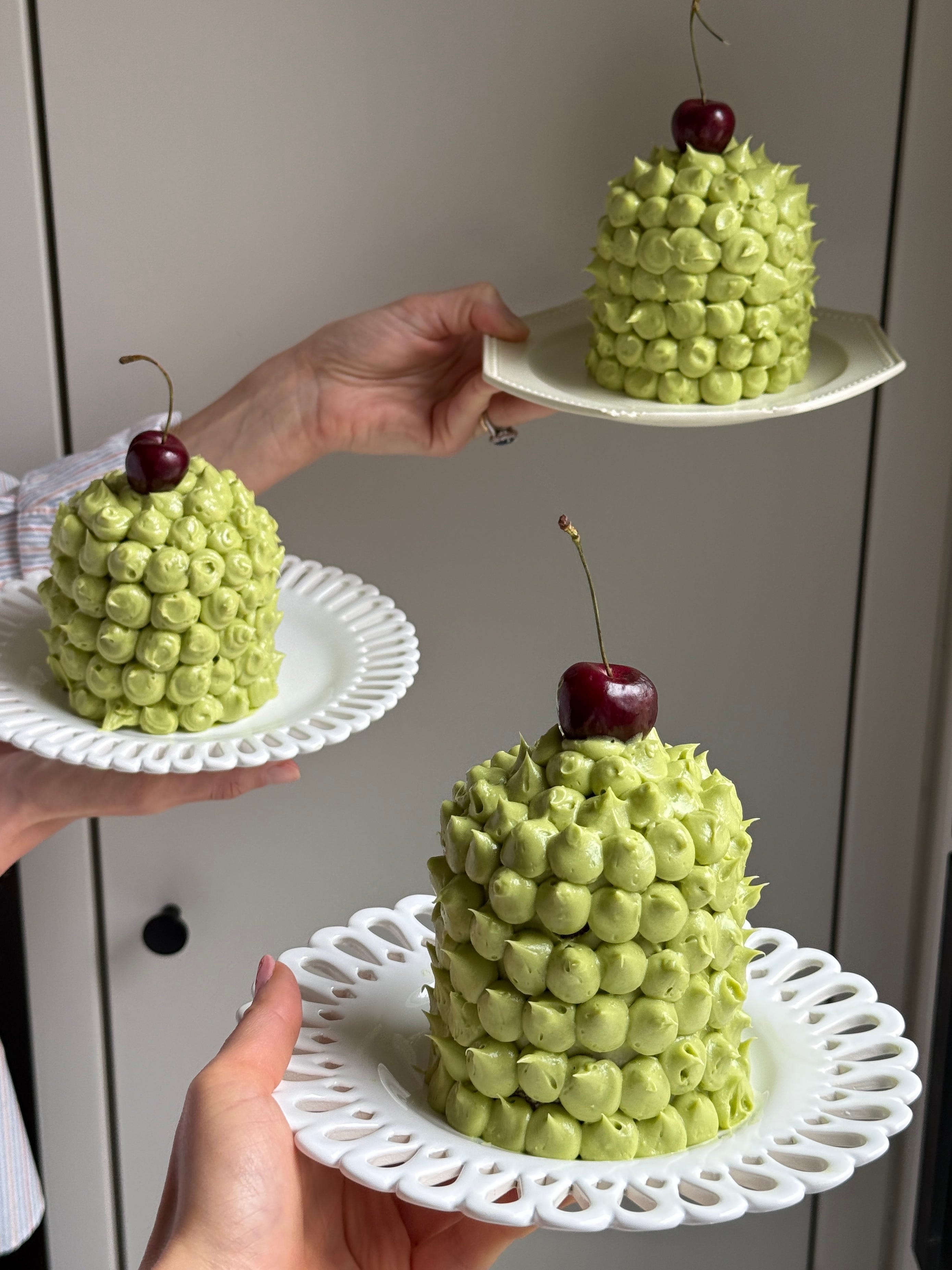 “I first discovered matcha when I moved to New York City and worked in the art world. Initially, I ordered matcha lattes just to fit in, even though I thought they tasted like hay. Six years later, I have one every single day. My love for matcha grew even more when I started putting it in my baked goods, and I adore the matcha and white chocolate combo in these two-layer mini cakes. For a more brightly colored green sponge, I recommend using a ceremonial grade matcha versus a culinary grade matcha. It’s also important to use high-quality white chocolate and avoid white chocolate chips. Guittard is my favorite brand. French buttercream can be a little scary at first. It gets soupy and can look like it’s curdling when you add the butter. Keep beating it, and you’ll end up with a silky and not too sweet white chocolate buttercream—it will all be worth it.”