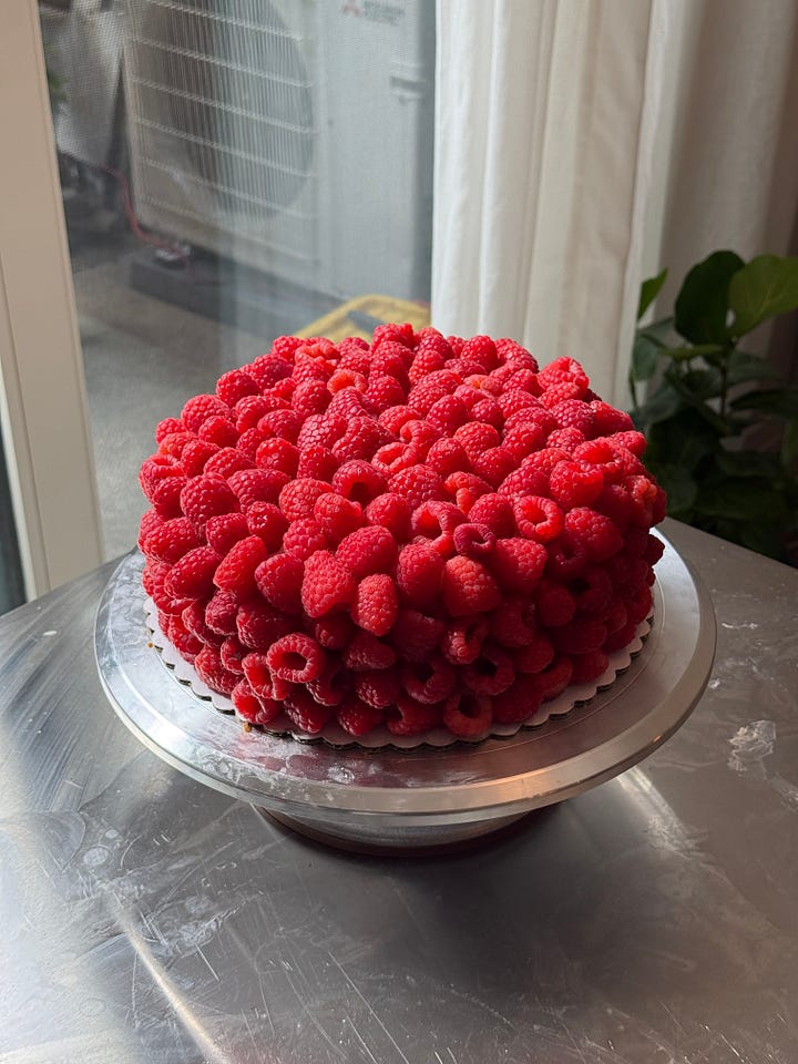 Frost the cake with the remaining buttercream. No need for it to look perfect, as the cake will get covered in raspberries. (See note.) Starting at the foot of the cake, gently press raspberries into the buttercream. This gives the following raspberries a bit of support (think of it as building a wall).