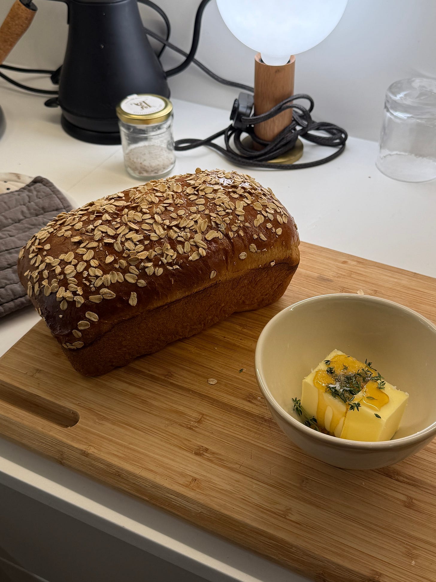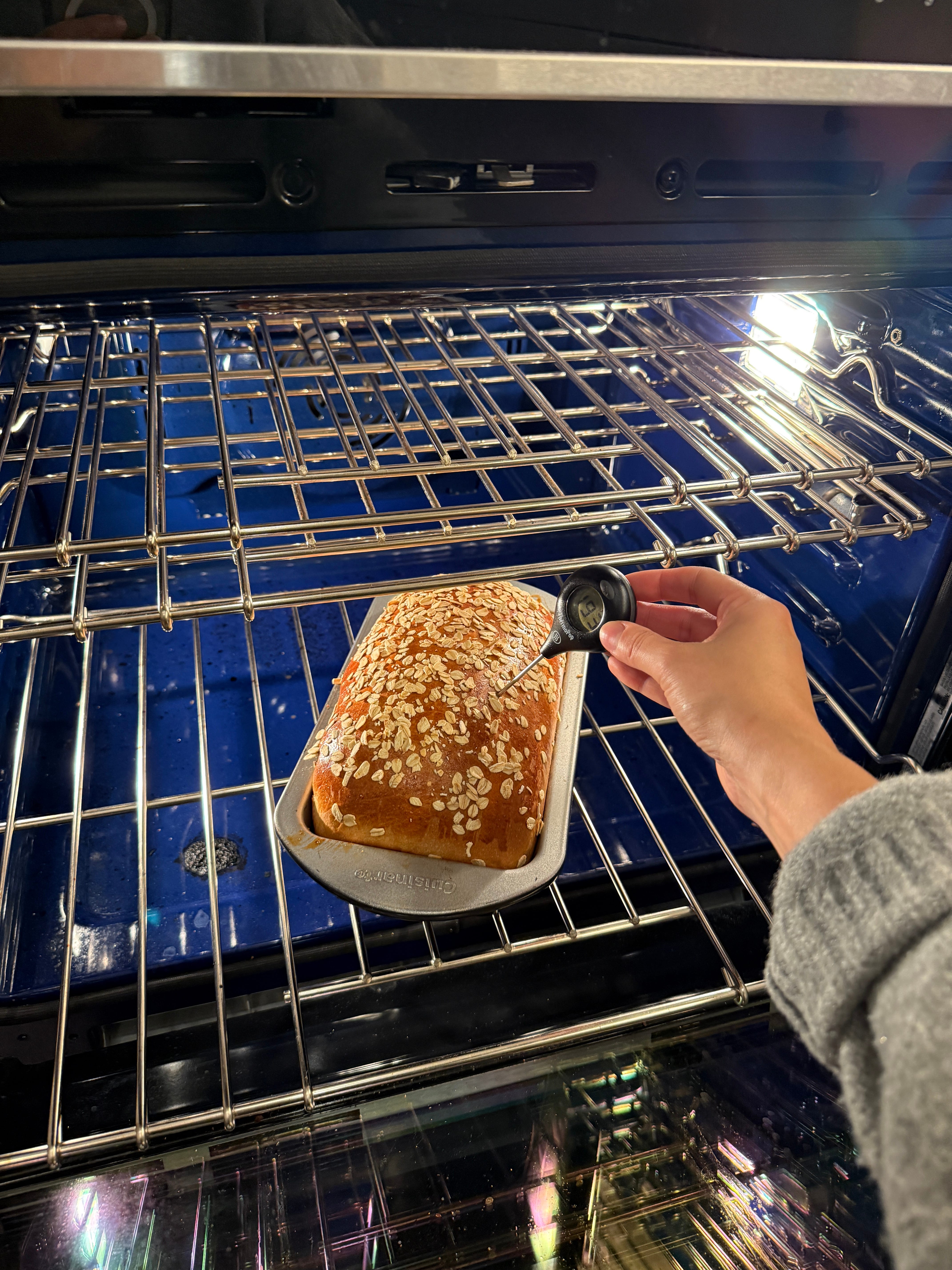 If I could go back and fix this in the written recipe, I would, but instead of brushing the loaf with milk before topping it with oats, brush it with egg wash instead of milk. While the milk still gives it a nice finish, it doesn’t stick to the oats as well.